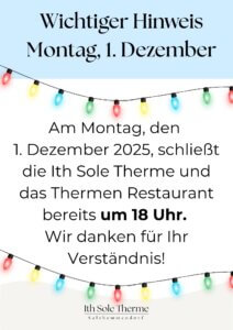 Am Montag, den 1. Dezember 2025, schließen die Therme und das Thermen Restaurant bereits um 18:00 Uhr.